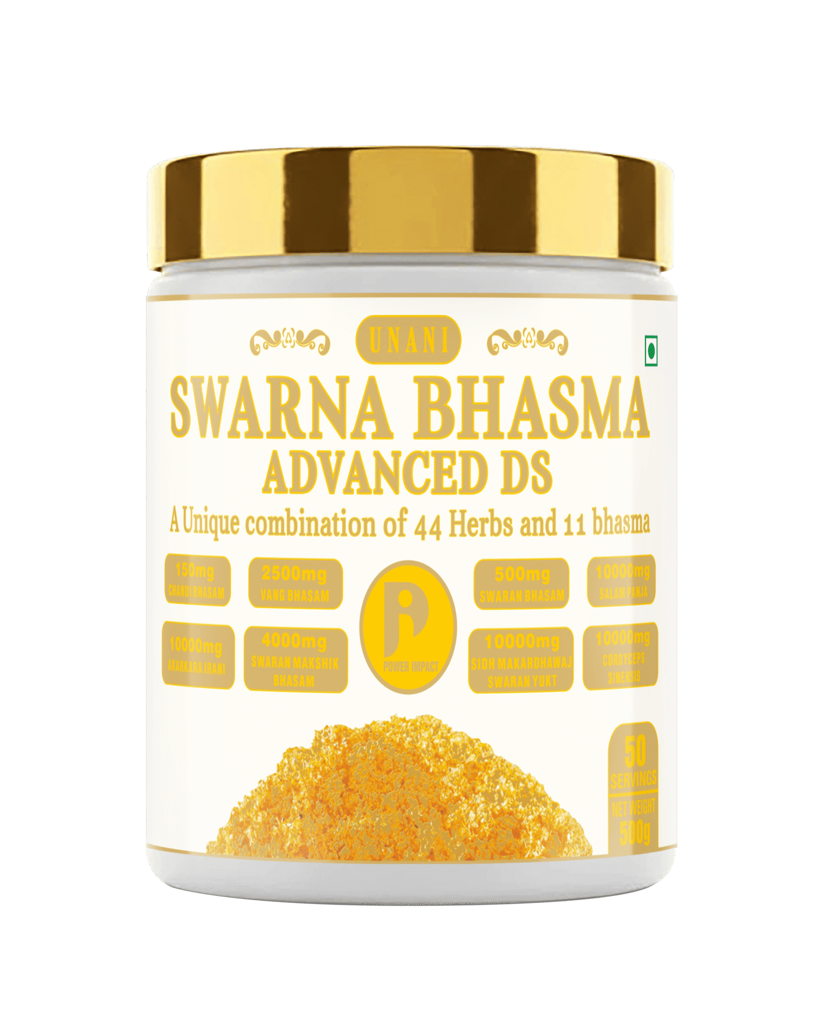 Power Impact Unani Swarna Bhasma Advanced DS is a powerful double-strength formulation crafted with a highly potent blend of 44 traditional herbs and 11 classical bhasma.